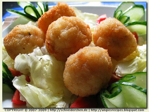 - Heat the oil in a deep pan until hot. Fry the rice balls 5 at a time, about 5 minutes until they've turn golden brown. Serve immediately on a bed of salad.